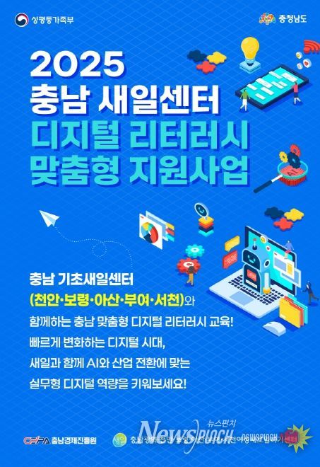 뉴스펀치 강영선 기자 | 충남경제진흥원 내 충남광역여성새로일하기센터는 천안·보령·아산·부여·서천 등 도내 5개 기초새일센터와 함께 '2025 새일센터 디지털 리터러시 맞춤형 지원사업'을 본격적으로 추진한다고 밝혔다.