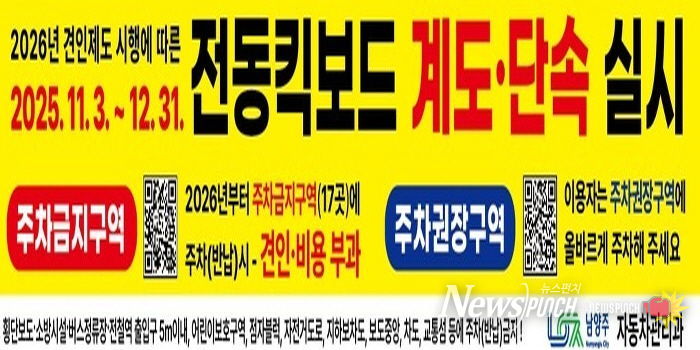 뉴스펀치 김길룡 기자 | 남양주시는 2026년부터 본격 시행 예정인 전동킥보드(개인형 이동장치, PM) 견인제도의 원활한 시행을 위해 오는 11월부터 계도․단속과 홍보활동을 집중 추진한다고 밝혔다.