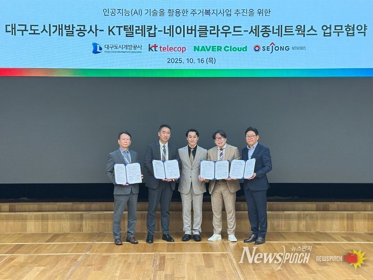 뉴스펀치 조평훈 기자 | 대구도시개발공사는 10월 16일 KT텔레캅, 네이버클라우드, 세종네트웍스와 업무협약(MOU)을 체결하고, AI 기술을 활용한 돌봄안심주택 서비스 구축을 위한 협력체계를 마련했다.