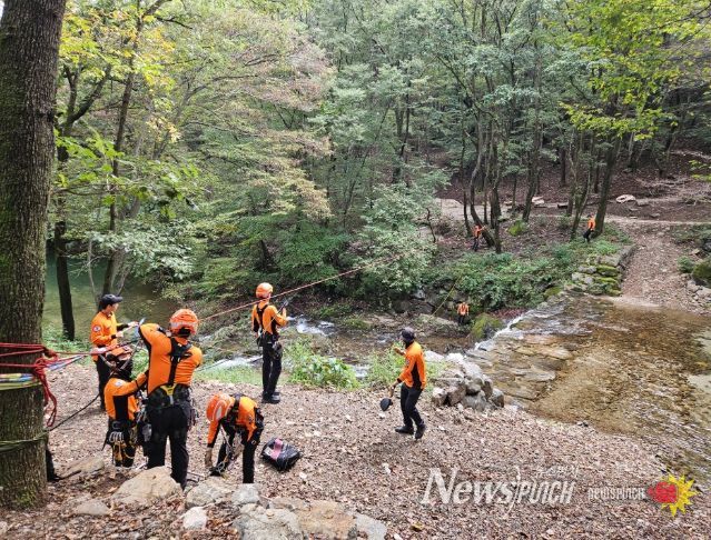 뉴스펀치 김길룡 기자 | 김천소방서는 10월 17일 황악산 일원에서 산악사고 발생 시 현장 대응 능력 향상을 위한‘산악사고 인명구조 특별훈련’을 실시했다.
