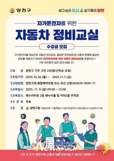 뉴스펀치 김완규 기자 | 양천구는 오는 11월 9일 오전 해누리타운에서, 운전자들이 꼭 알아야 할 자동차 기본 지식을 쉽고 실생활에 바로 적용할 수 있도록 배우는 ‘자동차 정비교실’을 무료로 운영한다고 19일 밝혔다.