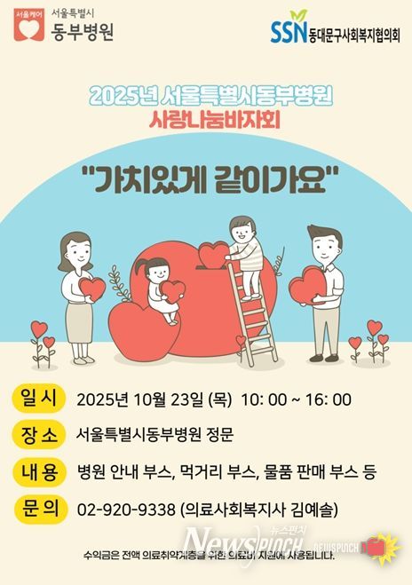 뉴스펀치 김완규 기자 | 서울시 동부병원이 지역사회와 함께하는 따뜻한 나눔의 장을 마련한다. 동부병원은 23일 오전 10시, 동부병원 정문 앞에서 사랑나눔 바자회 ‘가치있게 같이가요’를 개최한다.