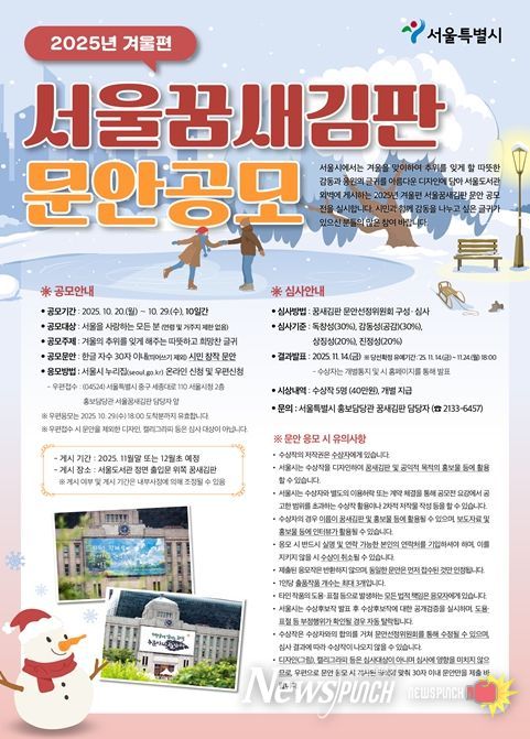 뉴스펀치 김완규 기자 | 서울시가 ‘겨울의 추위를 잊게 해주는 따뜻하고 희망찬 글귀’를 주제로 한 ‘2025년 겨울편 서울꿈새김판 문안 공모’를 10월 20일부터 10월 29일까지 10일간 진행한다. 서울시 누리집을 통한 온라인 신청 또는 우편 신청으로 참여할 수 있다.