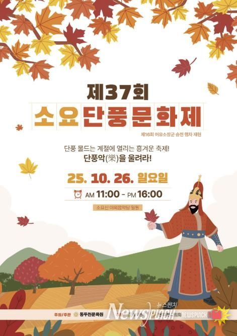뉴스펀치 김길룡 기자 | 동두천시 소요산 야외음악당 일원에서 오는 10월 26일 오전 11시부터 동두천문화원이 주최하고 동두천시가 후원하는‘제37회 소요단풍문화제 및 제16회 어유소장군 행차 재현’이 열린다.