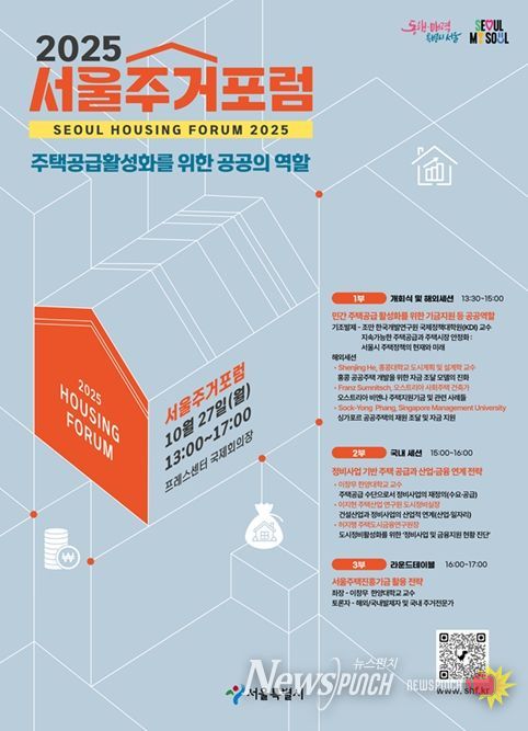 뉴스펀치 김완규 기자 | 서울시는 주택공급 활성화를 위해 국내외 전문가들과 ‘주택진흥기금’의 실행전략을 마련하고 정비사업을 점검하기 위한 ‘서울주거포럼’을 10월 27일 한국프레스센터에서 개최한다. 주택정책에 관심있는 시민 누구나 참여할 수 있으며, 26일까지 ‘서울주거포럼 누리집’에서 신청하면 된다.