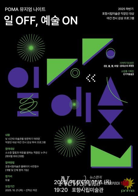 뉴스펀치 김길룡 기자 | 포항시립미술관은 오는 11월 5일부터 6일까지 양일간 직장인을 대상으로 한 야간 전시 감상 프로그램 ‘POMA 뮤지엄 나이트: 일 OFF, 예술 ON’을 운영한다.