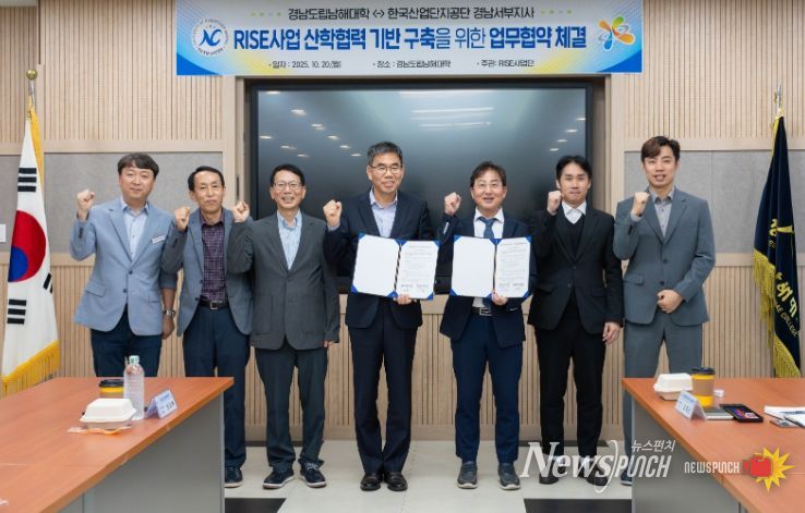 뉴스펀치 김길룡 기자 | 경남도립남해대학(총장 노영식)은 20일 오후 2시 교내 혁신학습지원실에서 한국산업단지공단 경남서부지사와 ‘경남 지역혁신중심 대학지원체계(RISE) 사업’ 추진을 위한 업무협약을 체결했다고 밝혔다.