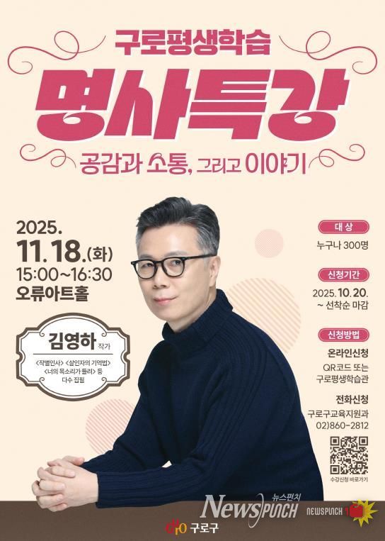뉴스펀치 김완규 기자 | 구로구가 오는 11월 18일 오류아트홀에서 김영하 작가를 초청해 ‘구로평생학습 명사특강’을 개최한다.