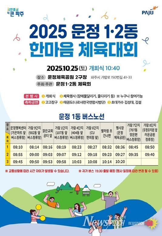 뉴스펀치 김길룡 기자 | 운정1·2동 체육회는 오는 25일 운정체육공원(가람로 150번길 41-33)에서 ‘2025 운정1·2동 한마음 체육대회’를 개최한다고 밝혔다.