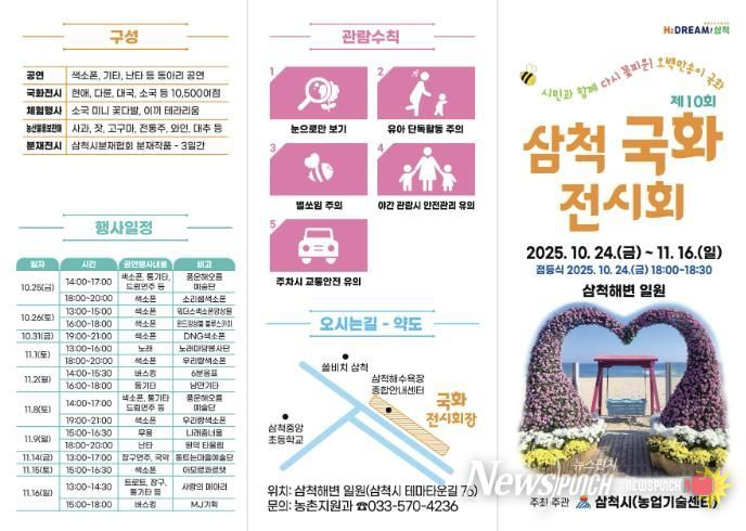 시 관계자는 “올해도 삼척해변에서 시민과 관광객들이 함께 즐길 수 있는 국화전시회를 마련했다”며 “가족, 연인, 친구와 함께 방문해 가을의 향기 속에서 아름다운 사진과 추억을 남기시길 바란다”고 전했다.