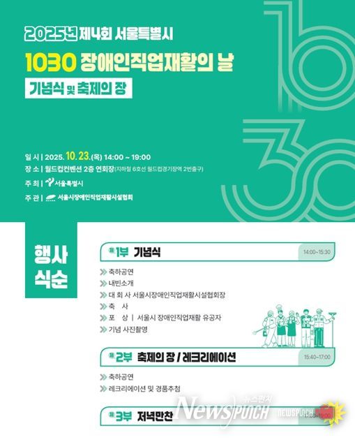 뉴스펀치 김완규 기자 | 서울시는 10월 23일 오후 2시, 마포구 월드컵컨벤션에서 '제4회 서울특별시 1030 장애인직업재활의 날 기념식 및 축제의 장'이 열린다고 밝혔다.