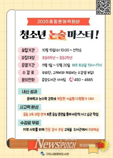 뉴스펀치 김길룡 기자 | 구미시립중앙도서관은 청소년들의 기초 문해력과 논리적 사고력 향상을 위해 마련한 논술특별프로그램 ‘청소년 논술마스터’ 수강생을 시립중앙도서관 누리집에서 선착순으로 모집하고 있다.