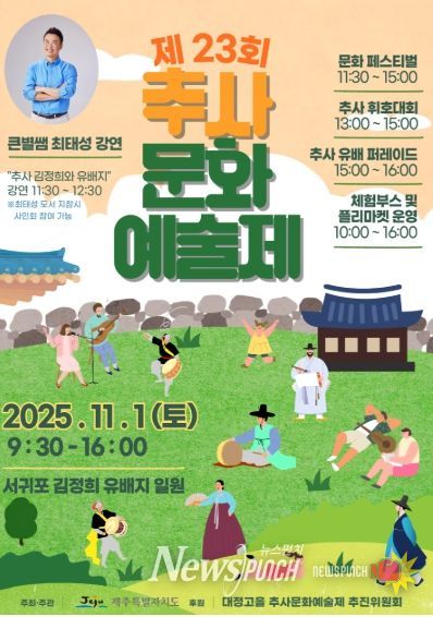 뉴스펀치 김길룡 기자 | 제주특별자치도 세계유산본부는 11월 1일 서귀포 김정희 유배지 일원에서 ‘제23회 추사문화예술제’를 개최한다.