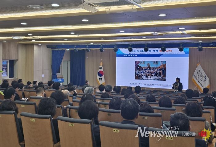 뉴스펀치 김길룡 기자 | 경상북도구미교육지원청은 10월 21일부터 22일까지 관내 초·중·고·특수학교 관리자(교장, 교감), 경상북도교육청 직속기관 및 구미교육지원청 소속기관장 및 부서장 등 200여 명을 대상으로 고위직 4대폭력(성희롱, 성폭력, 성매매, 가정폭력) 예방 교육을 실시했다.