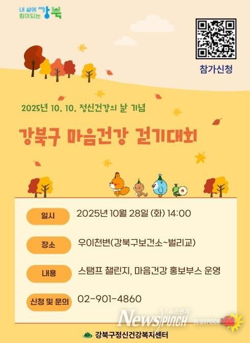 뉴스펀치 김완규 기자 | 서울 강북구는 오는 28일 오후 2시부터 4시까지 정신건강의 날 기념 마음건강 걷기대회를 개최한다.