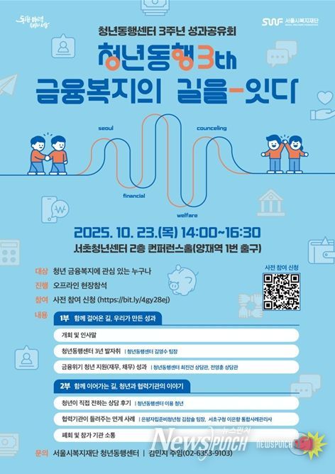 이에 지난 3년간 센터 운영 성과를 공유하는 자리를 마련하고자 23일 오후 2시 서초청년센터 2층 컨퍼런스홀에서 '청년동행 3년, 금융복지의 길을 잇다:청년동행센터 3주년 성과공유회'를 개최한다.