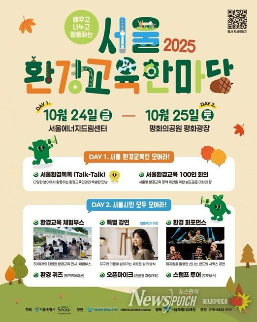뉴스펀치 김완규 기자 | 서울시와 녹색서울시민위원회는 10월 24일부터 25일까지 월드컵공원 내 서울에너지드림센터 및 평화광장 일대에서 서울 환경교육정책에 대해 알아보고 체험할 수 있는'2025 서울 환경교육한마당'을 개최한다. ‘배우고 나누고 행동하는 서울환경교육한마당’을 주제로 열리는 이번 행사는 서울 환경교육의 방향을 함께 논의하고 시민과 소통하는 자리로 마련된다.