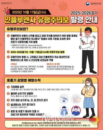질병관리청은 10월 17일 0시를 기점으로 전국에 ‘인플루엔자 유행 주의보’를 발령했다. 표본 감시 결과, 최근 4주간 인플루엔자 의사 환자 발생이 지속 증가했으며, 40주차(9.28.~10.4.)에 표본 감시 기관 의원급 외래환자 1천 명당 12.1명으로 이번 절기 인플루엔자 유행 기준(9.1명)을 초과했다.