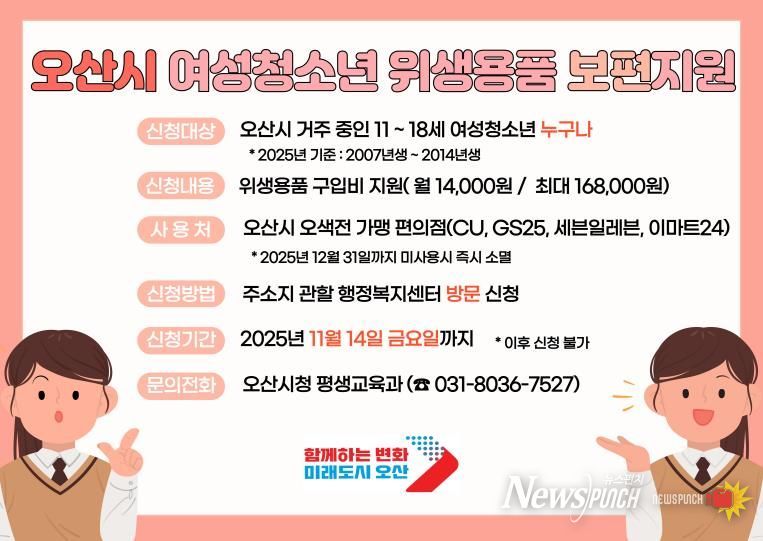 뉴스펀치 김길룡 기자 | 오산시는 여성청소년의 건강권 보장과 보편적 복지 실현을 위해 올해 처음 시행한 ‘여성청소년 위생용품 보편지원사업’의 신청을 오는 11월 14일 마감한다. 아직 신청하지 않은 대상자는 혜택을 받을 수 있도록 서둘러 참여해야 한다.