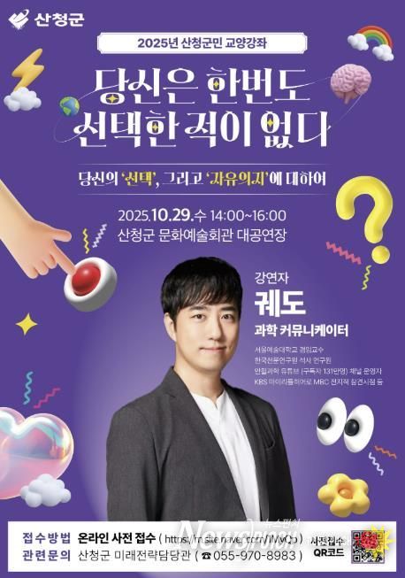 뉴스펀치 김길룡 기자 | 산청군은 오는 29일 문화예술회관 대공연장에서 과학 커뮤니케이터 궤도를 초청해 강연을 펼친다고 24일 밝혔다.