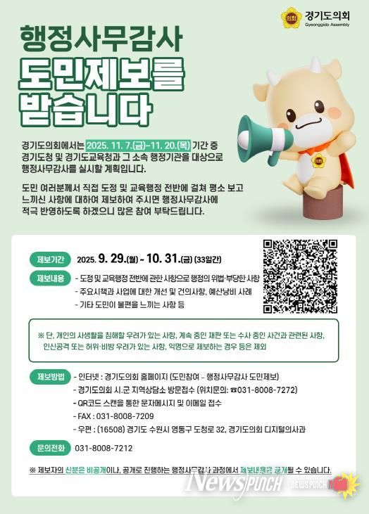 경기도의회는 도민 참여형 감사를 실현하기 위해 도민제보 제도를 운영하고 있으며, 접수된 제보는 상임위원회별 감사자료로 활용될 예정이다.