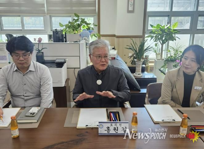 뉴스펀치 김길룡 기자 | 경기도의회 문화체육관광위원회 홍원길 의원(국민의힘, 김포1)이 지난 23일 향산초중학교에서 열린 간담회에서 외벽 방수공사 진행 상황을 점검하고 향후 보완 과제를 논의했다.