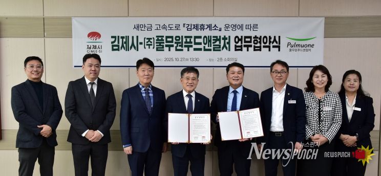 뉴스펀치 김길룡 기자 | 김제시는 27일 ㈜풀무원푸드앤컬처와 '새만금전주간' 고속도로 개통에 따라 새롭게 조성되는‘김제휴게소’운영에 따른 업무협약을 체결했다고 밝혔다.