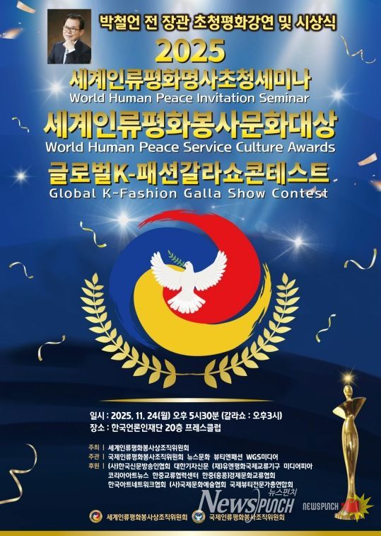 뉴스펀치 조은별 기자 | ‘2025 세계인류평화명사초청세미나 및 세계인류평화봉사문화대상 시상식’이 오는 11월 24일 오후 5시 30분, 서울 태평로 한국언론재단 20층 프레스클럽에서 열린다.