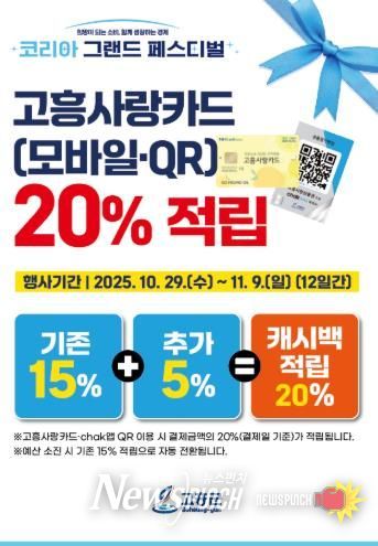 고흥군은 전국적으로 진행되는 코리아 그랜드 페스티벌에 발맞춰 지역 소비 및 상권 활성화를 위해 모바일 고흥사랑상품권 적립률을 5% 상향해 총 20% 특별 적립 이벤트를 마련했다.