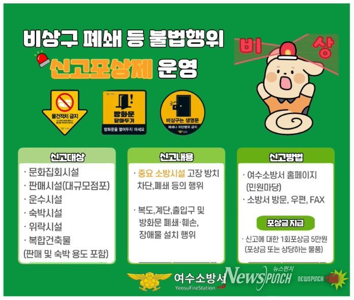 뉴스펀치 김길룡 기자 | 여수소방서(서장 서승호)는 소방시설 및 피난·방화시설의 불법행위를 시민이 직접 신고하면 포상금을 지급하는'소방시설 등 불법행위 신고포상제'를 적극 홍보 중이라고 30일 밝혔다.