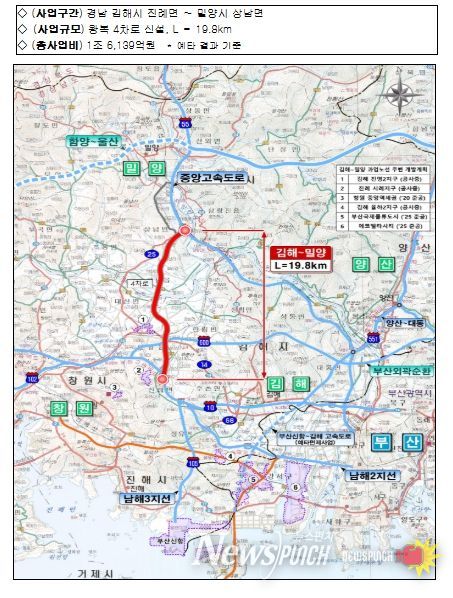 ➊김해~밀양 고속도로 신설은 경남 김해시 진례면 ~ 밀양시 상남면 19.8㎞ 구간 왕복 4차로를 신설하는 사업(총사업비 1.6조원)으로, 부산항신항 및 가덕도신공항의 접근성을 제고하고 대구·경남 지역 산업단지 물류 경쟁력 강화에 기여할 것으로 기대된다.