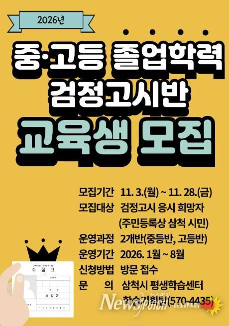 뉴스펀치 김길룡 기자 | 삼척시가 학력 미취득 시민들의 학습 기회를 확대하기 위해 2026년도 중·고등 졸업학력 검정고시반을 운영한다.