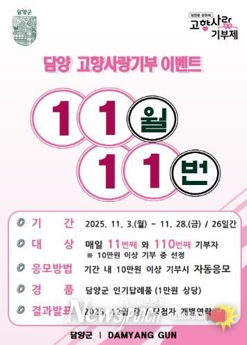 뉴스펀치 김길룡 기자 | 담양군이 11월을 맞이해 3일부터 28일까지 매일 11번째, 110번째 고향사랑 기부자에게 인기 답례품을 증정하는 이벤트를 진행한다.