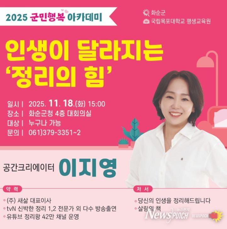 뉴스펀치 김길룡 기자 | 화순군은 오는 11월 18일 오후 3시, 화순군청 4층 대회의실에서 2025 군민행복 아카데미 9회차 강연을 개최한다고 밝혔다.