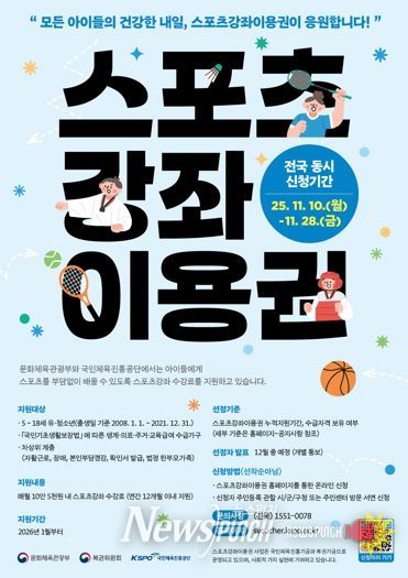 신청 기간은 오는 10일부터 28일까지다. 스포츠강좌이용권 누리집을 통해 온라인으로 신청할 수 있다. 또한, 거주지 행정복지센터를 방문해 서면 신청도 가능하다.