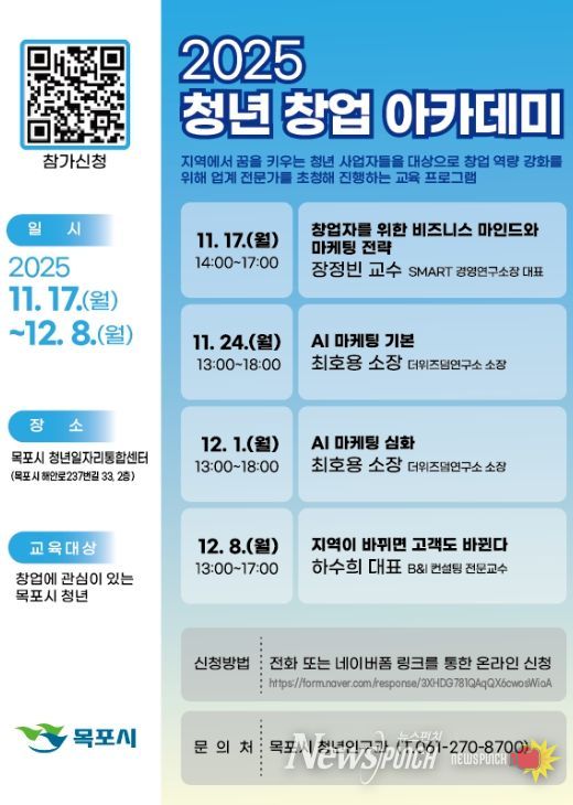 뉴스펀치 김길룡 기자 | 목포시는 지역 청년 창업자의 경쟁력 강화를 위해 오는 11월 17일부터 12월 8일까지 총 4회에 걸쳐 ‘2025년 청년 창업 아카데미’를 운영한다.