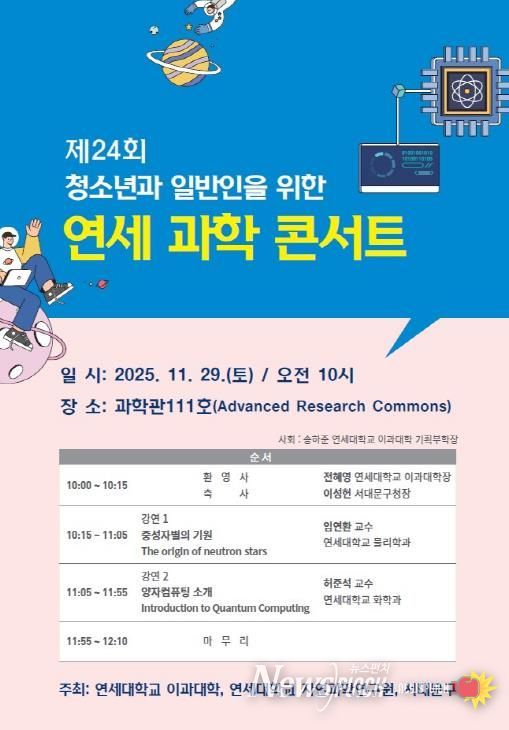 뉴스펀치 김완규 기자 | 서대문구가 연세대학교 이과대학과 공동으로 이달 29일 토요일 오전 10시부터 2시간여 동안 연세대 과학관 111호에서 ‘제24회 연세 과학 콘서트’를 개최한다.