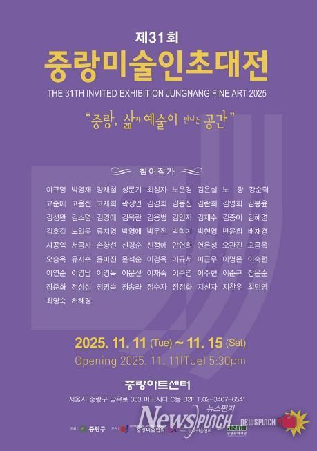 뉴스펀치 김완규 기자 | 시민들의 문화예술 향유의 시간을 제공하고 작가는 최신작 위주로 독창적 미술 작품을 공개하는 '2025 제31회 중랑미술인초대전'은 주최 서울 중랑구, 주관 중랑미술협회로 11월 11일 ~ 11월 15까지 중랑아트센터에서 "중랑, 삶과 예술이 만나는 공간" 타이틀로 그룹전이 진행 중에 있다.