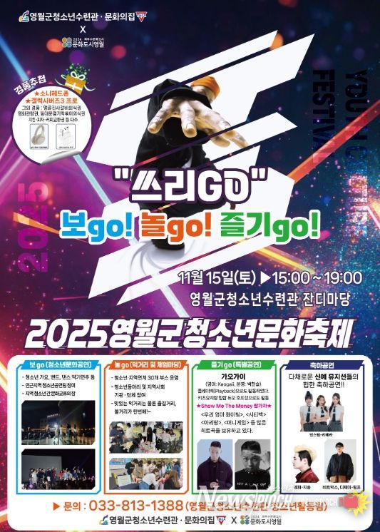 뉴스펀치 김길룡 기자 | 영월군청소년수련관·영월군청소년문화의집 공동 주관하는 2025년 영월군청소년문화축제『“쓰리GO”(보go·놀go·즐기go)』가 오는 11월 15일 오후 3시부터 영월군청소년수련관 잔디마당 일대에서 청소년과 지역 군민을 대상으로 개최된다.