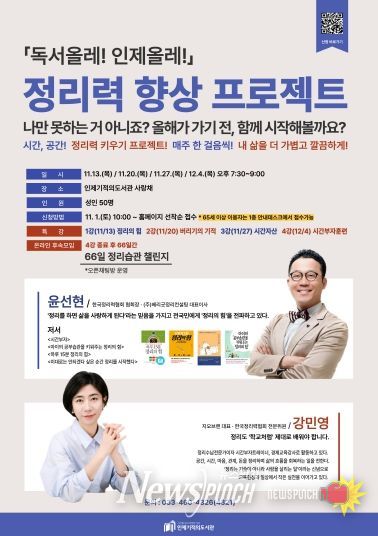 뉴스펀치 김길룡 기자 | 인제기적의도서관이 오는 11월부터 12월까지 현대인의 효율적인 공간‧시간 관리법을 주제로 한 ‘정리력 향상 프로젝트’ 특강을 운영한다. 이번 특강은 체계적인 정리 습관을 통해 군민의 삶의 질을 높이고, 지속 가능한 정리 문화를 확산시키는 데 목적이 있다.