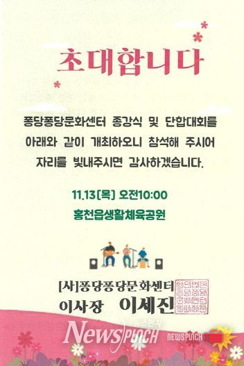 뉴스펀치 김길룡 기자 | 홍천군은 11월 13일, 홍천읍 생활체육공원에서 '제4회 퐁당퐁당 문화센터 종강식 및 단합대회'를 개최한다고 밝혔다.