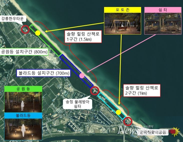 이어 2차 공사 구간인 송정물레방아쉼터에서 안목해맞이공원까지 약 1㎞ 구간도 2026년 내 기존 쉼터 및 벤치 등에 야간 포토존과 볼라드등을 설치할 예정이다.