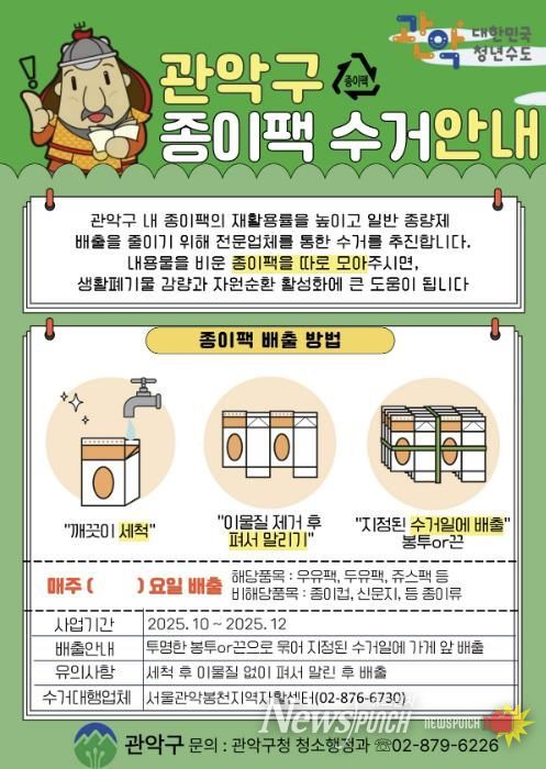 뉴스펀치 김완규 기자 | 관악구가 오는 12월 말까지 ‘종이팩 중점 수거사업’을 집중적으로 추진하여, 종이팩의 재활용률을 높이고 일반 종량제 배출을 줄이는데 주력한다.