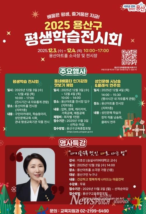 뉴스펀치 김완규 기자 | 서울 용산구가 오는 12월 3일부터 4일까지 용산아트홀 전시장과 소극장에서 ‘배움은 평생, 즐거움은 지금!’을 주제로 ‘2025 평생학습 전시회’를 개최한다.