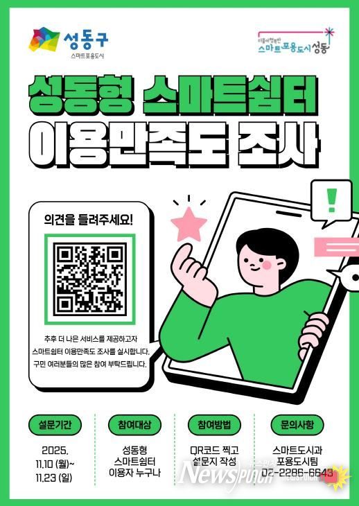시범 도입한 AI 기반 플랫폼은 ‘성동형 스마트쉼터 만족도 조사’에 처음으로 적용된다. 설문조사는 11월 10일부터 23일까지 2주간 진행되며, 성동형 스마트쉼터 이용 만족도, 향후 스마트쉼터 활성화 방안 및 창의적인 아이디어를 수렴하는 것에 중점을 두고 있다. 성동구 누리집(홈페이지), 관내 스마트쉼터, 동주민센터 등에 게시된 정보무늬(QR코드)를 통해 설문에 참여할 수 있다.