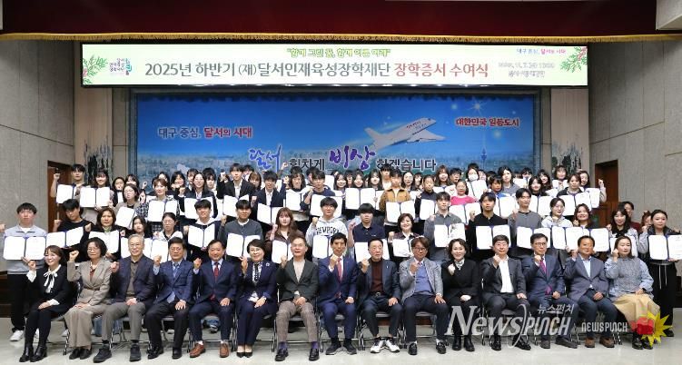 뉴스펀치 조평훈 기자 | 대구 달서구는 (재)달서인재육성장학재단이 구청 대강당에서 2025년 하반기 장학금 수여식을 개최했다고 13일 밝혔다.