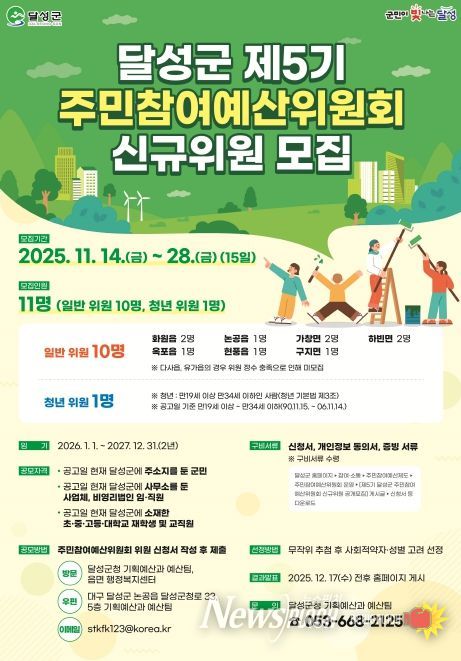 뉴스펀치 조평훈 기자 | 달성군은 11월 14일부터 28일까지 제5기 주민참여예산위원회 신규위원 11명을 모집한다.