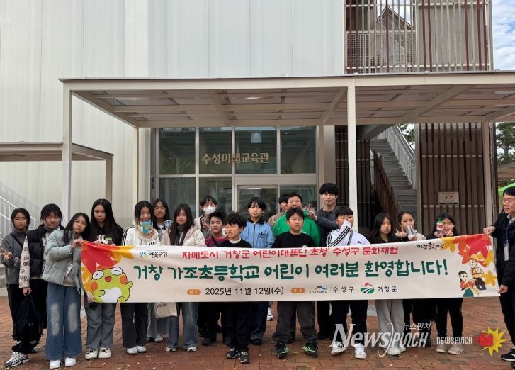 뉴스펀치 조평훈 기자 | 대구 수성구는 지난 12일 자매도시 경남 거창군 가조초등학교 학생·교사 및 관계 공무원으로 구성된 어린이대표단 25명을 초청해 수성구의 다양한 문화를 체험하는 프로그램을 진행했다.