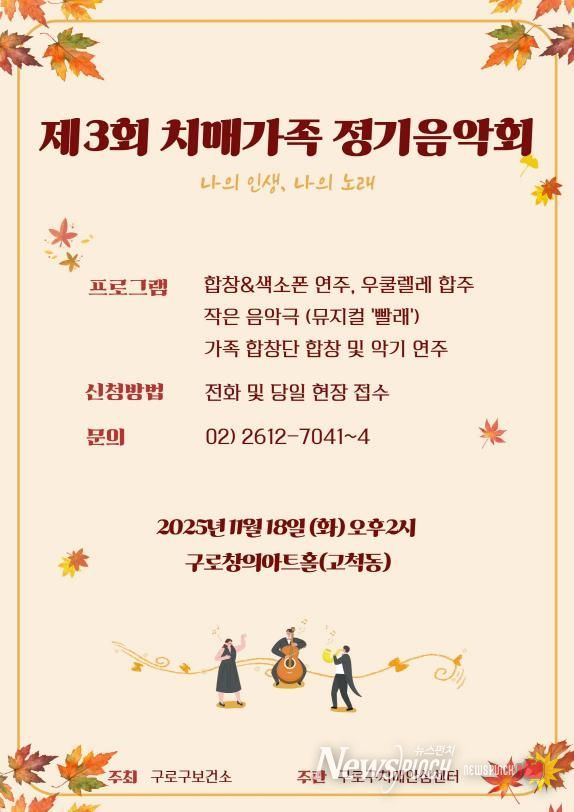 뉴스펀치 김완규 기자 | 구로구가 오는 18일 구로창의아트홀(경인로 416, 4층)에서 ‘제3회 치매가족 정기음악회’를 개최한다.
