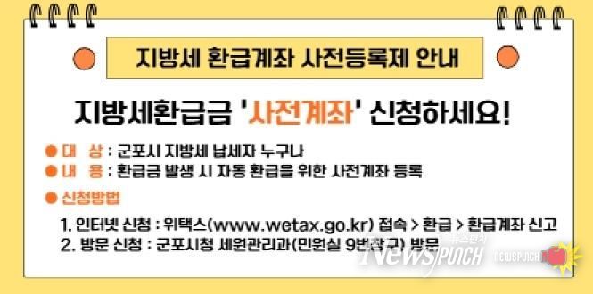 뉴스펀치 김길룡 기자 | 군포시는 납세자 권익보호와 편의 증진을 위해 ‘지방세 환급계좌 사전등록제’를 운영하고 있다고 14일 밝혔다.